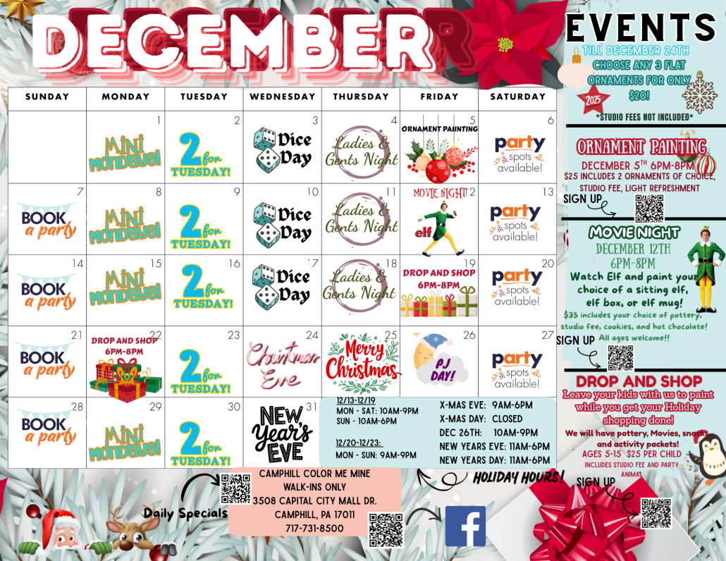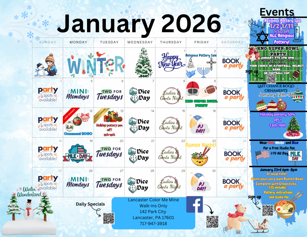 We accept Walk-Ins ONLY (as space allows) with the exception of Valentines Day and Mothers Day. If there are no customers, we may close the store 15 minutes early without warning. Your pottery will take UP TO 2 WEEKS to get back to you. WE DO NOT SHIP POTTERY! Thank you for your understanding as we respect each other to be creative together! To-Go Kits are still available to pick up and paint at home!