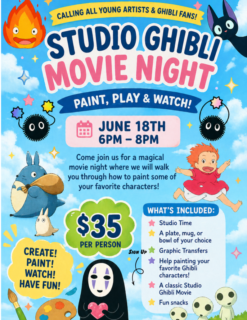 We accept Walk-Ins ONLY (as space allows) with the exception of Valentines Day and Mothers Day. If there are no customers, we may close the store 15 minutes early without warning. Your pottery will take UP TO 2 WEEKS to get back to you. WE DO NOT SHIP POTTERY! Thank you for your understanding as we respect each other to be creative together! To-Go Kits are still available to pick up and paint at home!